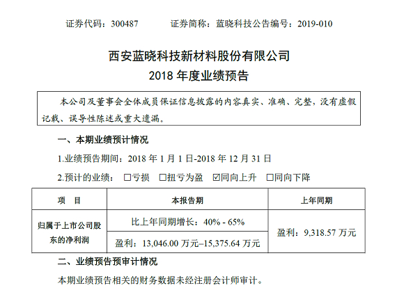 近日,蓝晓科技(300487)发布2018年度业绩预告显示,报告期内公司预计归属于上市公司股东的净利润1.3亿元–1.54亿元,同比上涨40%-65%。
