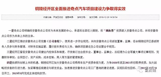 2018年12月26日,安徽铜陵安徽省商务厅发布《铜陵经开区全面推进奇点汽车项目建设力争取得实效》公告,奇点公司明确将安徽奇点公司作为未来发展的中心和未来上市的主体,目标在科创板上市,并将总部迁入铜陵,力争2020年底至2021年初取得资质;同时,经开区将推进安徽奇点公司工厂基地的建设进度,实现明年8月完成主体结构封顶。安徽省燃料电池再添新军,铜陵市打造燃料电池特色板块