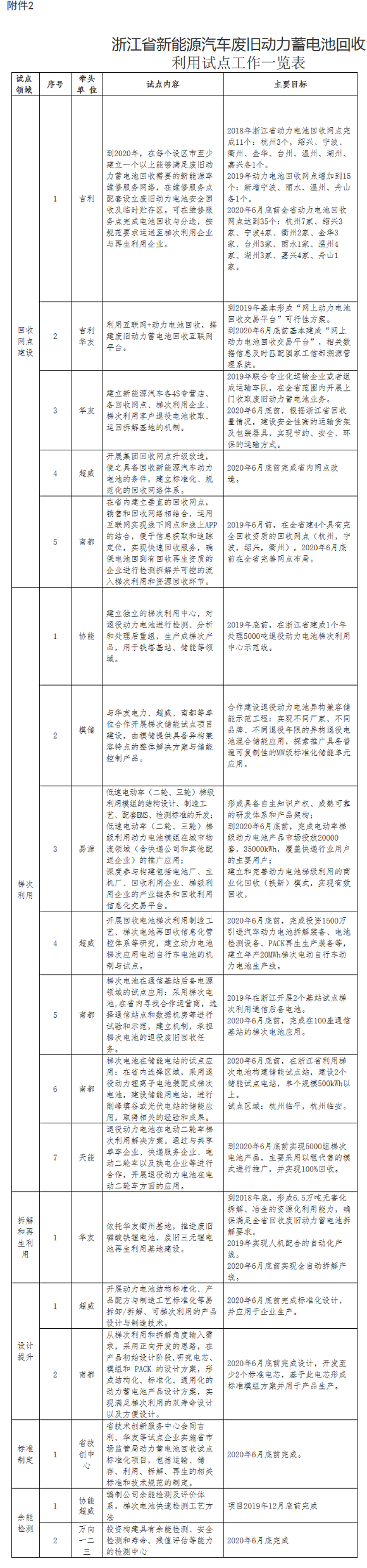 为加快推进浙江省新能源汽车动力电池回收利用试点工作,浙江省经信厅会同省级相关部门和企业发布了《浙江省新能源汽车动力电池回收利用试点实施方案》。