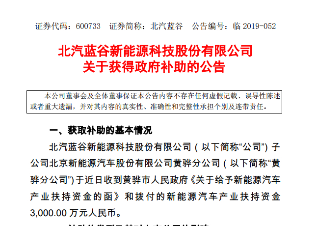 7月10日,北汽蓝谷新能源科技股份有限公司发布关于获得政府补助的公告,北汽蓝谷新能源科技股份有限公司(以下简称“公司”)子公司北京新能源汽车股份有限公司黄骅分公司(以下简称“黄骅分公司”)于近日收到黄骅市人民政府《关于给予新能源汽车产业扶持资金的函》和拨付的新能源汽车产业扶持资金3000.00 万元人民币。
