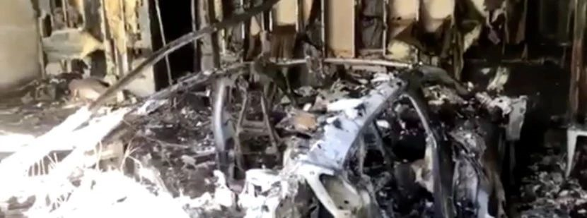 如图1可看出,保时捷Taycan电动汽车已经烧的面目全非,只剩下还没融化的车架,其余毁坏严重。