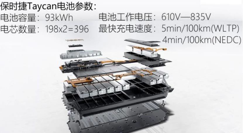 如图3所示,保时捷Taycan的双层蓄电池包容量93KWh,综合续航里程463公里。理想状态下,Taycan Turbo