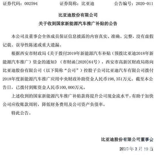 3月10日,比亚迪发布公告称,西安市高新区财政局将向公司控股子公司比亚迪汽车有限公司拨付2018年度新能源汽车推广应用中央财政补助资金19.84亿元。截至目前,已拨付到账资金10亿元。