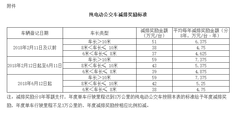 对年度单车行驶里程达到3万公里的纯电动公交车给予减排奖励,年度单车行驶里程不足3万公里的,年度减排奖励按比例扣减(减排奖励标准见附件,分8年等额支付)。