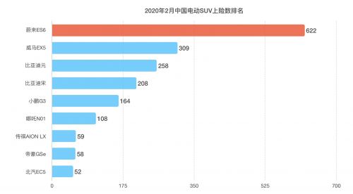 3月11日,中国汽车技术研究中心(以下简称“中汽中心”)公布了2月国内车市上险数据。根据数据显示,蔚来ES6上险数达622辆,首次在豪华中型SUV排行榜上攀至第四位。