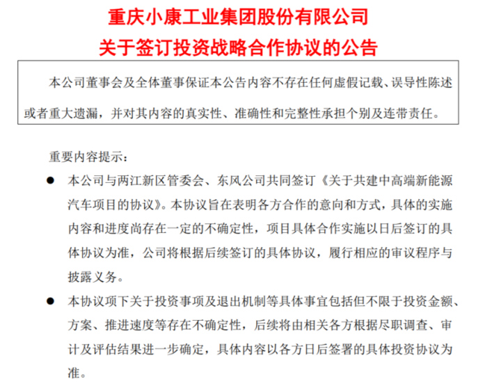 公告称,东风公司与小康股份同意以金康新能源作为双方在中高端新能源整车板块的合作平台。同时,为支持东风公司和小康股份基于金康新能源的进一步深化合作重庆市人民政府及两江新区管委会将指定主体或基金共同成立 SPV(以下简称“SPV”),由SPV向金康新能源投资20亿元,增资后SPV 预计将持有金康新能源 28.74%的股权。