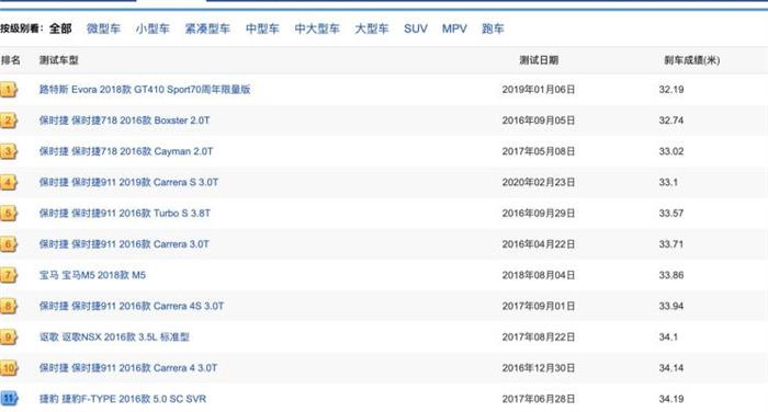 值得一提的是,如果比亚迪汉EV的实测100-0km/h制动距离真能达到32.8米,它将击败我们实测的保时捷718 2016款 Cayman 2.0T的33.02米成绩,在汽车之家制动距离榜单中排名第三,仅次于第二名保时捷718 2016款 Boxster 2.0T的32.74米。