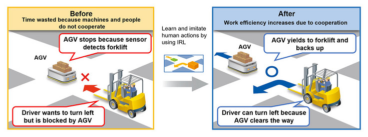 在人机混合的工作环境中,三菱电机的协作式AI技术能够让AGV采用视频录制的、有关工作区的图像,以学习和模仿人类的动作。通过学习让步等动作,该技术帮助AGV避开碰撞或僵持等不必要的情况。三菱电机在公司内部进行的模拟显示,与在传统人机混合工作环境中,采用智能程度不那么高的机器进行操作相比,新技术将工作效率提高了约30%。
