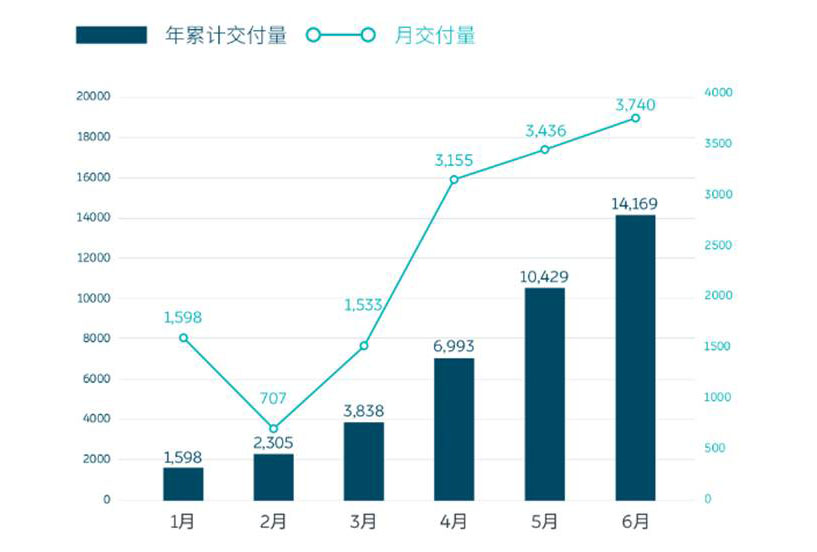 根据蔚来公布的数据,2020年6月份,蔚来完成车辆交付3740台,同比增长179%,再创月度新高,其中包括1264台蔚来ES8和2476台蔚来ES6。自3月以来,蔚来已连续四个月实现环比上涨。