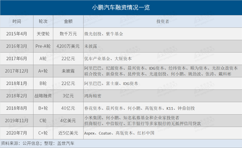 7月20日,小鹏汽车宣布完成C+轮近5亿美元融资,主要投资方为Aspex、Coatue、高瓴资本和红杉中国。据悉,本次融资的金额将主要用于新车研发、营销渠道拓展以及无人驾驶软件的研发。