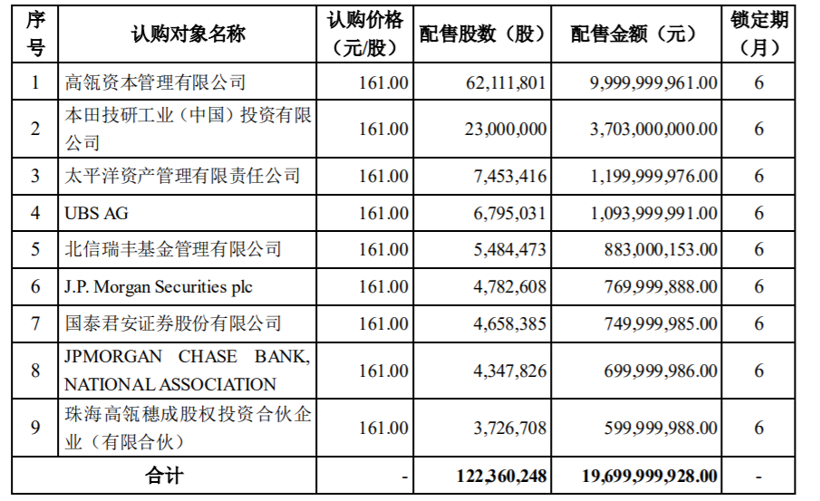 公告书显示,共有38家投资者参与此次申购,最终确定9家发行对象,分别为高瓴资本管理有限公司、本田技研工业(中国) 投资有限公司、太平洋资产管理有限责任公司、UBS AG、北信瑞丰基金管理有 限公司、J.P. Morgan Securities plc、国泰君安证券股份有限公司、JPMORGAN CHASE BANK, NATIONAL ASSOCIATION、珠海高瓴穗成股权投资合伙企业 (有限合伙)。