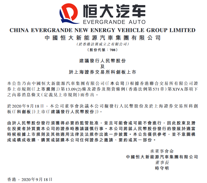 9月18日,在港股上市的恒大汽车发布公告称,公司董事会建议发行人民币股份及于上海证券交易所科创板上市。