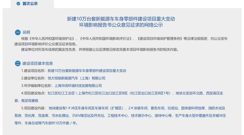 11月25日,上海企事业单位环境信息公开平台中的建设项目环评公告显示,恒大恒驰新能源汽车(上海)有限公司将新建10万台套新能源车车身零部件建设项目。 [详细]