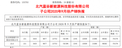 10月12日,北汽蓝谷发布北汽新能源9月销量数据,为2,245辆,相比去年同期的10,009辆,降幅达77.6%;1-9月累计销量为2.1万辆,较去年同期的9.8万辆,下滑78.6%。