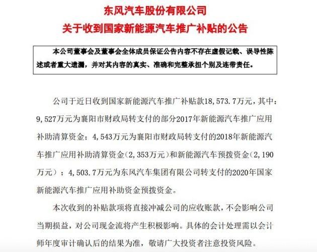 车友头条查阅相关信息显示,在此之前,今年1月21日,东风汽车收到襄阳市财政局转支付的2018年度新能源汽车推广应用补助资金预拨款1.39亿元;3月2日,收到2亿元国家新能源汽车推广补贴;4月30日,收到第二批2017年度新能源汽车购置补贴清算资金3亿元。