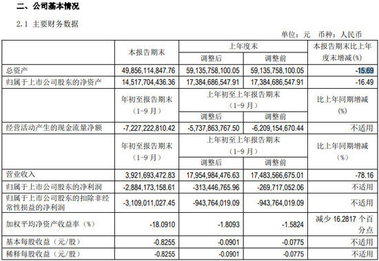 近日,北汽蓝谷(600733)公布2020年三季度经营业绩,截至9月30日,北汽蓝谷总资产为498.56亿元,同比上年度末减少15.69%,归属于上市公司股东净资产为145.18亿元,同比减少16.49%;营业收入为39.22亿元,同比大幅下降78.16%,归属于上市公司股东净利润为-28.84亿元,扣非后扩大至-31.09亿元。