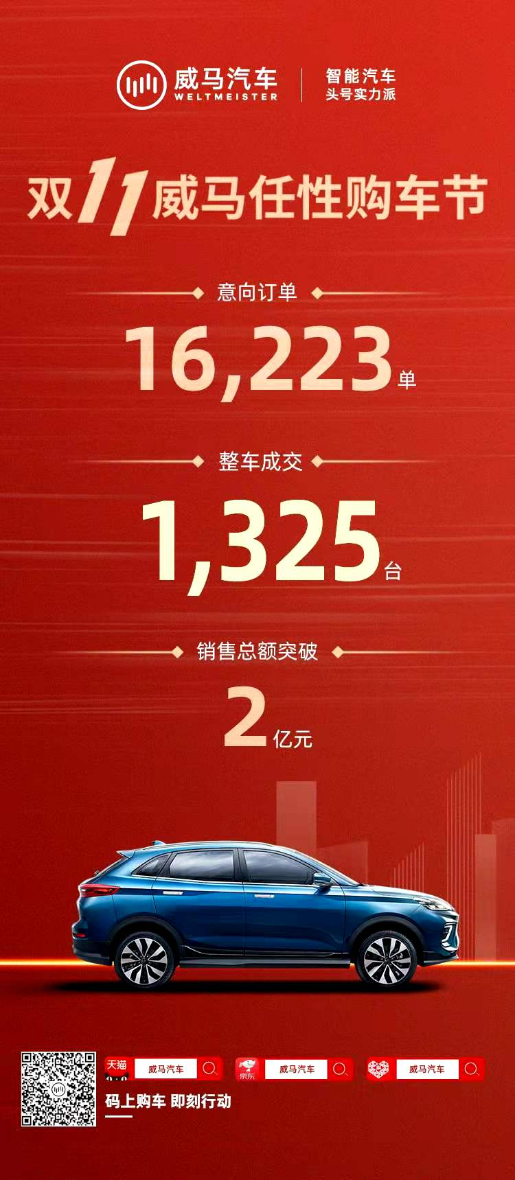 在全球疫情仍面临不确定性的大背景下,今年的“双十一”也成为提振市场信心,引领消费增长的新支点。作为智能汽车头号实力派,威马汽车持续聚焦用户体验,通过数字化、智能化技术,打通线上、线下壁垒,建立了全电商+线下渠道深度融合的新零售体系。据威马大数据统计,今年“双十一”期间,威马官方旗舰店访问量超950万人次,累计收获16,223位高意向用户,整车成交1,325台,成为唯一登上天猫双11热卖榜的智能汽车品牌。