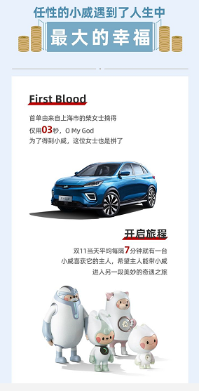 Technology”产品哲学的精髓,为用户带来由内而外的全场景式智能交互体验,自上市以来持续得到消费者的认可和青睐。在“双十一”当日,平均每隔7分钟就诞生一位新的威马车主,首台威马EX5-Z由来自上海市的柴女士摘得,仅用时3秒就“光速”成交,堪称最快“氪金”手速。