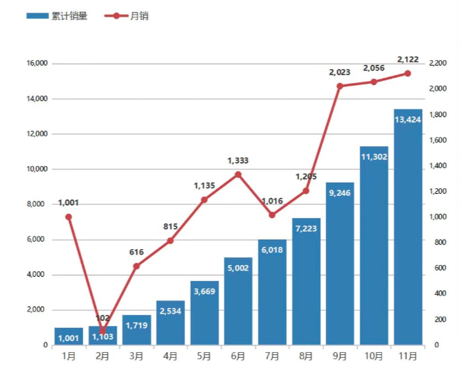今年前11个月累计销量13424辆,同比增长44%。11月初上市的哪吒V交付新车1067辆,占11月总交付量约50.28%。