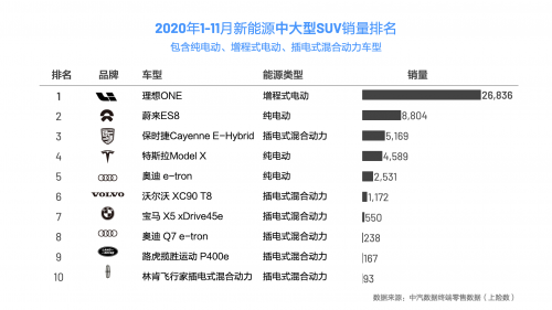 2020年1月至11月,理想ONE累计销售26836辆,在新能源中大型SUV细分市场排名第一,与第二名的蔚来ES8拉开较大差距,后者今年前11个月累计销量为8804辆,第三名分别是5169辆的保时捷Cayenne