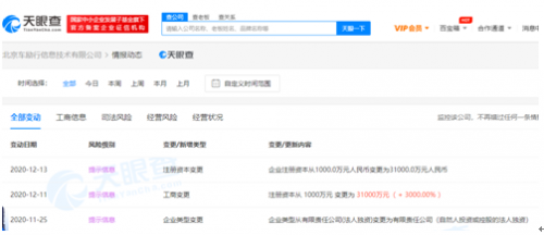 天眼查信息显示,12月11日,理想汽车的关联公司——北京车励行信息技术有限公司发生工商变更,其注册资本由1000万元变更为3.1亿元,增幅为3000%。