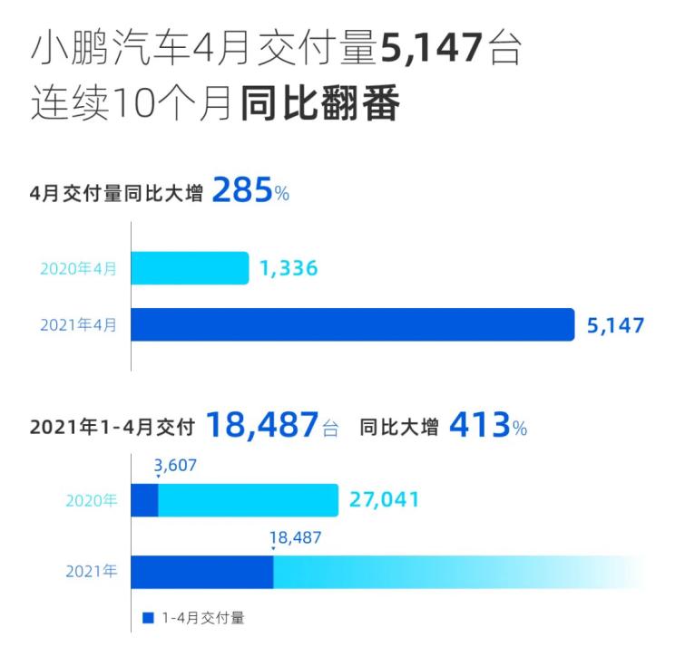 日前,小鹏官方公布了4月份的交付量成绩:2021年4月总交付量5147台,较去年同期增长285%。其中,小鹏P7交付量2995台,小鹏G3交付量2152台。截至2021年4月底,小鹏本年度累计交付量已达18487台,为去年同期五倍。
