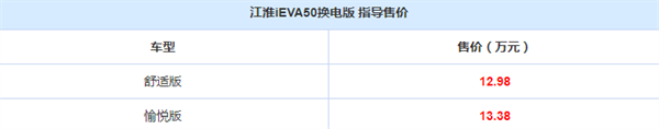 售12.98万元起 江淮iEVA50换电版上市