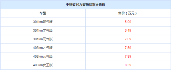 售5.99万元起 小蚂蚁20万蚁粉款上市
