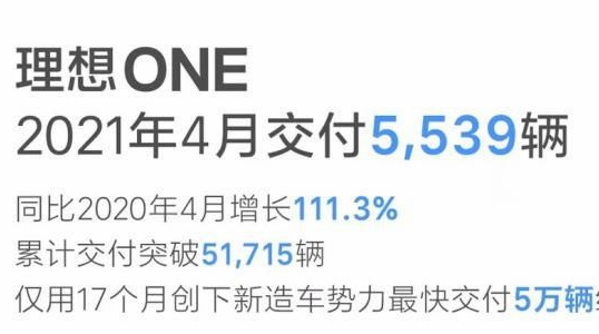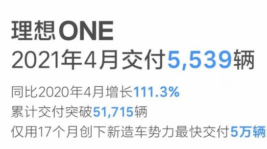 5月2日,理想汽车公布了4月交付数据。数据显示,截至4月底,理想汽车的累计新车交付量已经达到了51715辆,其中理想ONE在4月交付5539辆车,同比2020年4月增长111.3%。 [详细]