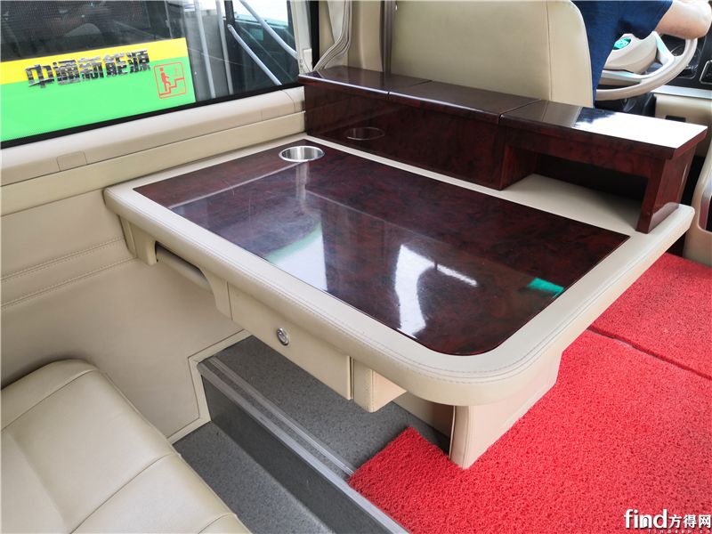 中通氢燃料商务车不仅在车辆左侧首个座椅处装配了一个办公桌,在右侧也配置了一个小办公桌,有水杯槽、储物柜以及220V电源接口,极大地方便了移动商务办公的需要,极大提升了商务接待的服务水平。