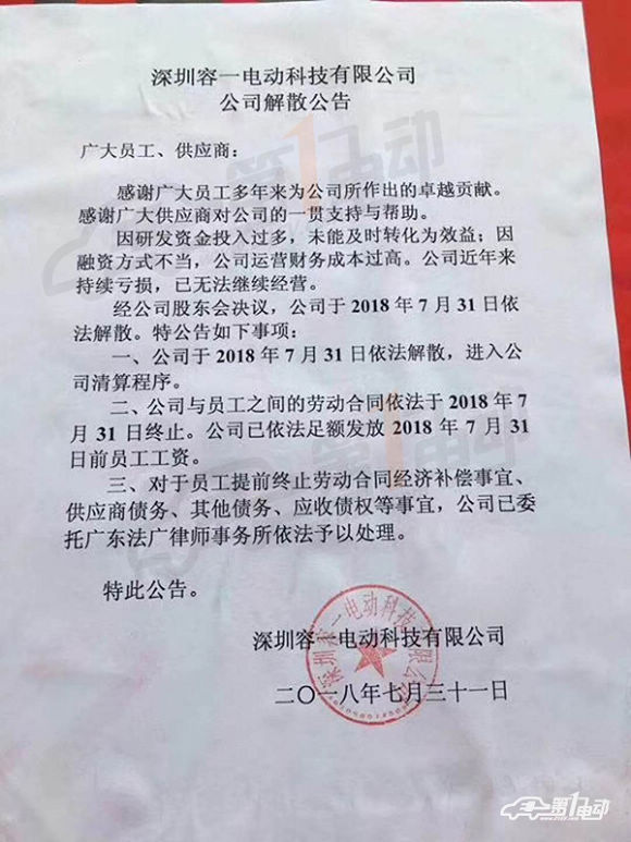 7月31日,深圳容一电动科技有限公司(下称容一电动)发布了公司解散公告,公告内容显示,公司于2018年7月31日依法解散,进入公司清算程序。