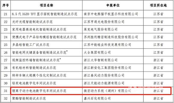 2018年7月31日,工信部发布《2018年智能制造试点示范项目公示》,共有99个示范项目上榜,其中微宏动力申报的“锂离子动力电池数字化车间试点示范”成功入围。