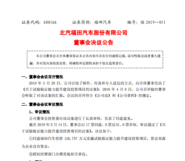 福田汽车拟建设智能网联、电子电控、 EMC、电动车、 NVH、底盘传动、重型车环模、材料、车身、整车对标、整车评价11个试验室及氢燃料客车试制验证车间、研发用试车跑道。项目总投资126,757万元,建设期三年。 [详细]