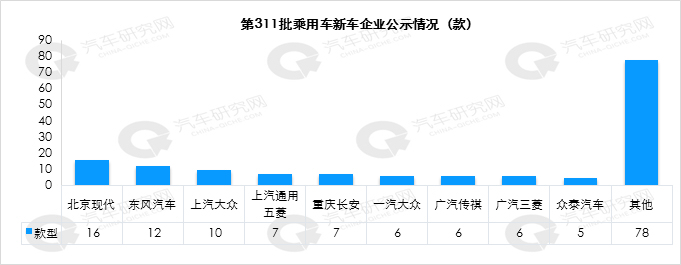 本批共有49家车企的153款乘用车车型申报,其中进入车辆最多的车企有:北京现代、东风汽车和上汽大众,均有10款车型以上车型进入,其他主要企业分别是:上汽通用五菱、重庆长安、一汽大众、广汽传祺、广汽三菱和众泰汽车。
