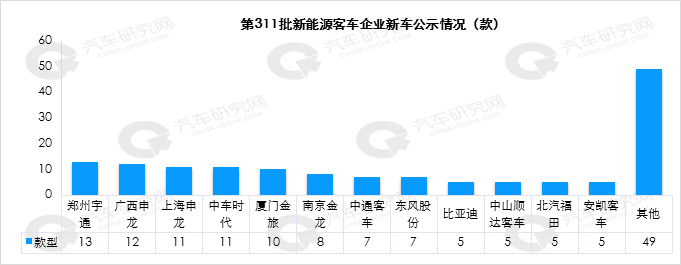 本批共有47家车企的163款客车车型申报,其中进入车辆最多的车企有:郑州宇通、申龙客车、广西申龙、中车时代、厦门金旅和中通客车,均有10款以上车型进入,其次分别是:东风股份、南京金龙、中山顺达客车、安凯客车、北汽福田和比亚迪。