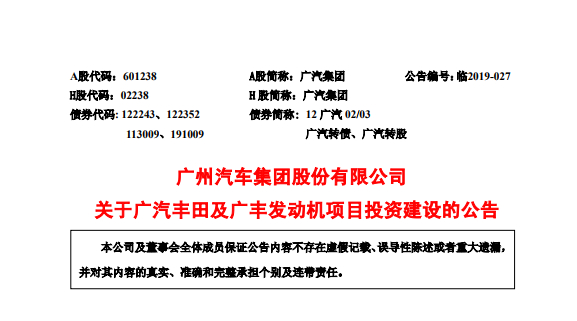 广汽丰田有关新能源车产能扩建项目一期、二期投资项目建设,两期项目合计新增产能40万辆/年,计划2022年全部建成投产,项目总投资1,132,988.6万元人民币(折合约164,394万美元),其中股东增资54,799万美元,本公司按50%持股比例增资27,399.5 万美元,其余资金由合营公司自筹。 [详细]