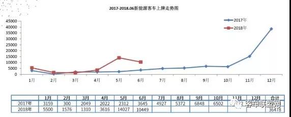 统计数据显示, 2018年6月份客车上牌10449辆,其中纯电动客车9398辆,虽然受政策影响环比下降24.26%,但同比去年还是大涨208.94%,插电式混合动力客车1011辆,环比下降35.4%,同比增长67.66%,另有燃料电池客车40辆。