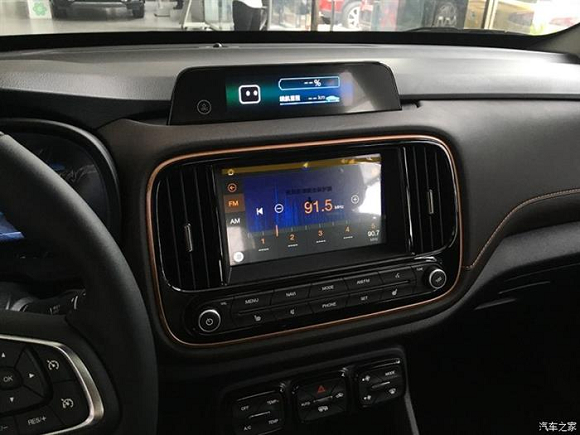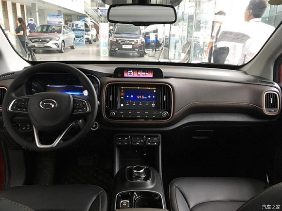 进入车内,传祺GE3的内饰设计年轻个性,而且与外观不同,内饰更多的采用了矩形元素,中控台上方有一块小的显示屏可以显示电量等信息,下方的液晶触摸屏则与空调出风口以及控制按键等集成在一个大的矩形框内,看起来比较简洁。