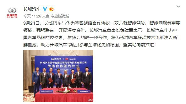 9月24日,华为技术有限公司(以下简称“华为”)与长城汽车股份有限公司(以下简称“长城汽车”)签署了战略合作协议。双方将在智能驾驶、智能网联、出行服务等领域开展深度合作。
