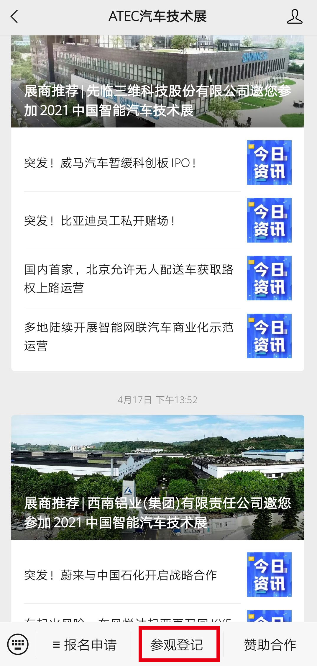 扫描上方二维码关注“ATEC中国汽车技术展”→ 点击自定义菜单“参观登记”;