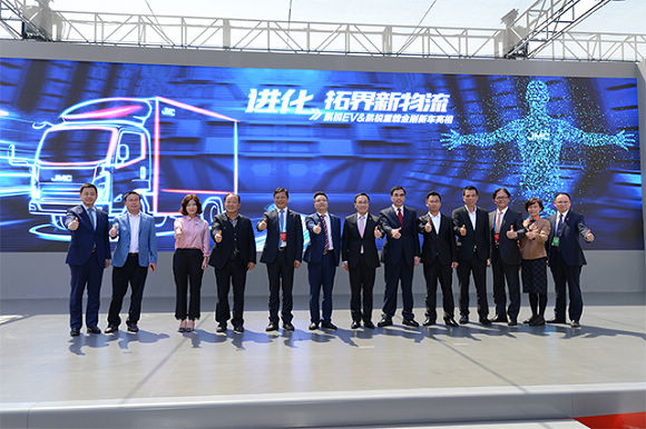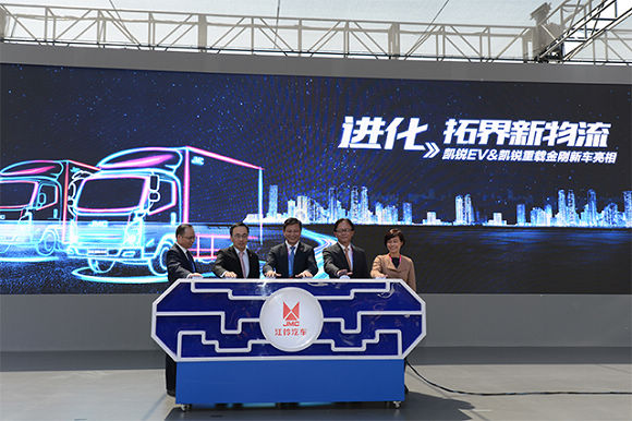 集团公司董事长、股份公司董事长邱天高、集团公司总经理陈远清、股份公司总裁范炘、股份公司第一执行副总裁熊春英、股份公司执行副总裁金文辉等为凯锐重载金刚和凯锐EV两款新车揭幕。