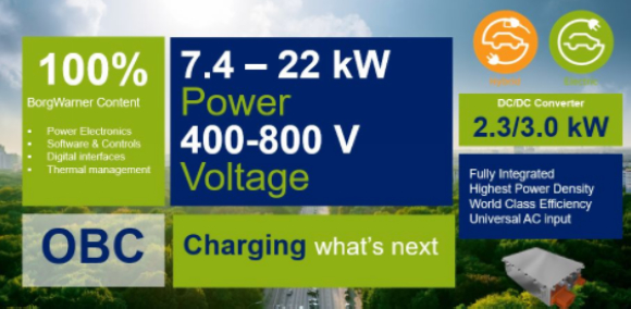 据悉,博格华纳车载交流充电机支持7.4千瓦、11千瓦和22千瓦额定输入功率,并可选择额定功率为2.3-3.0千瓦的DC/DC转换器。它兼容所有化学成分的电池,能承受400伏、650伏和800伏的电压。