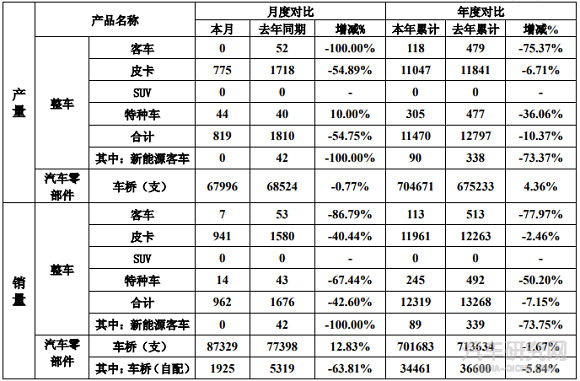 12月6日,曙光股份发布11月产销快报。数据显示,曙光股份11月生产整车553辆,同比下滑51.11%;1-11月产量总计5940辆,同比下滑59.79%。车桥1-11月产量下滑20.93%。11月整车销量为449辆,同比下滑65.57%;1-11月销量总计7240辆,同比下滑52.03%,车桥1-11月销量下滑62.51%。 [详细]