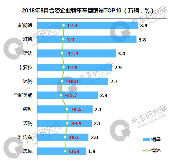 2018年8月合资企业轿车:新朗逸销售3.9万辆 同比增长1