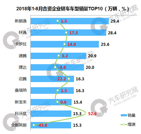 1-8月,合资轿车销量前十车型中,上汽大众新朗逸凭借新款车型累计销量排名榜首,共计销售29.4万辆,增速1.3%。主要车型中,上汽通用雪佛兰科沃兹表现优异,同比增幅超过50%;上汽通用别克全新英朗则下滑较大,降幅达到43.6%。
