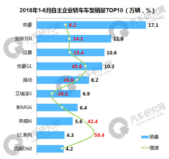 1-8月,自主轿车销量前十车型与单月销量排名变化较大,吉利汽车占据前五车型中的三席,其中帝豪累计销售17.1万辆,排名第一。主要车型中,北汽新能源EC系列表现优异,1-8月,共计销售4.3万辆,同比增长59.4%。