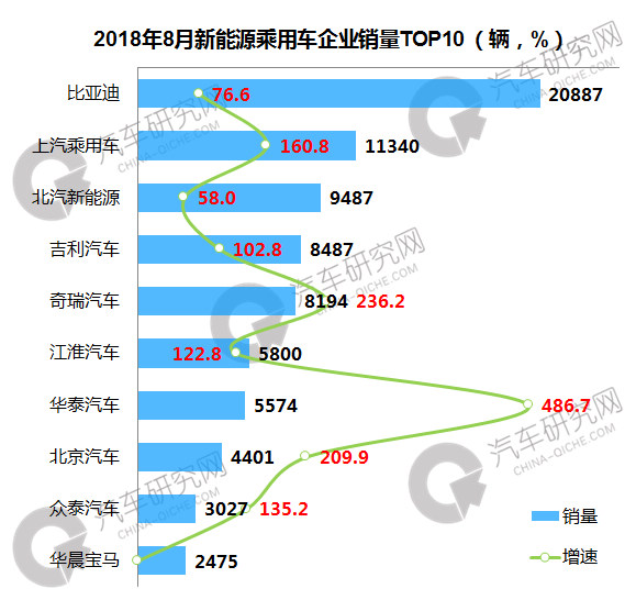 2018年8月新能源乘用车 比亚迪销量突破2万大关