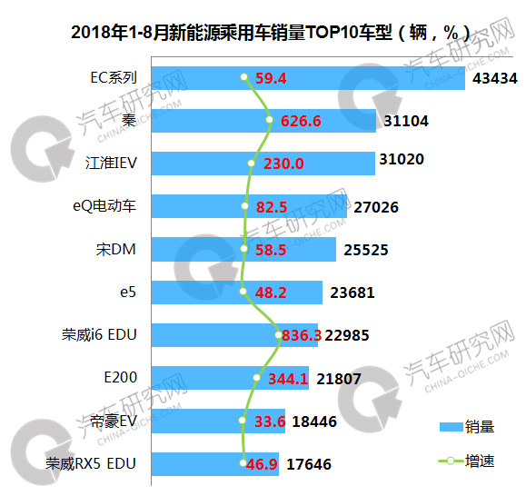 1-8月新能源乘用车车型中,北汽EC系列以超过4万辆的成绩遥遥领先,比排名第二的比亚迪秦足足多了1.2万辆;江淮IEV、奇瑞eQ电动车和比亚迪宋DM位居第3-5位,销量均在2.5万辆以上;前十车型中,荣威i6增幅最大,同比累计增长超过800%。