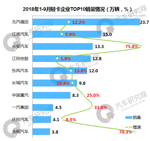 2018年9月轻卡企业:福田独占鳌头 金杯增速超200%