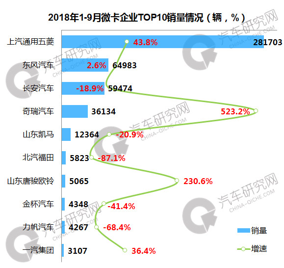 1-9月,微卡企业中,上汽通用五菱位居第一,销量达到281703辆,同比增长43.8%,东风汽车和长安汽车位居第二集团;前十企业中,奇瑞汽车增幅最大,同比增长523.2%。